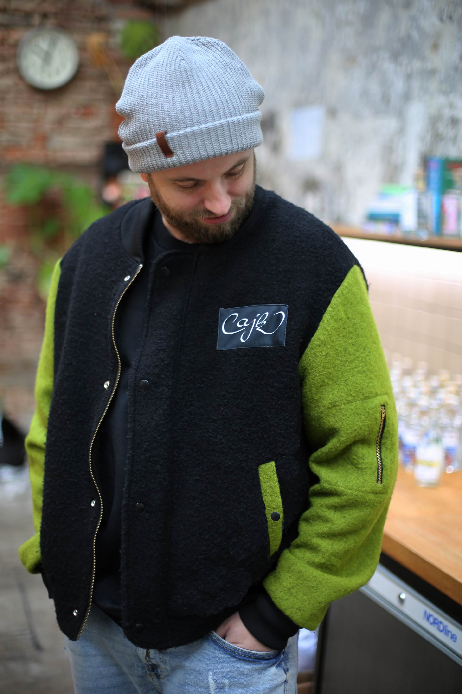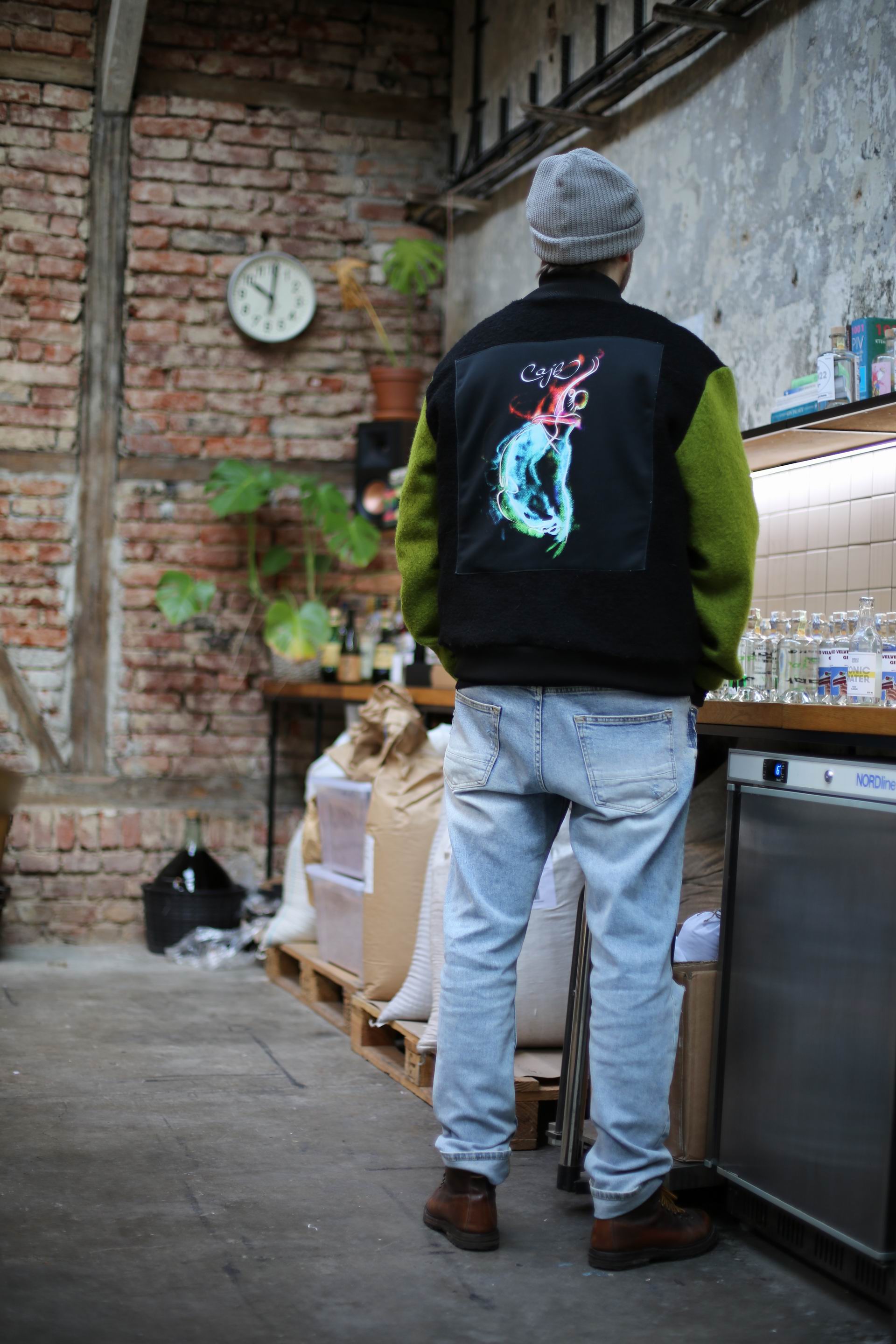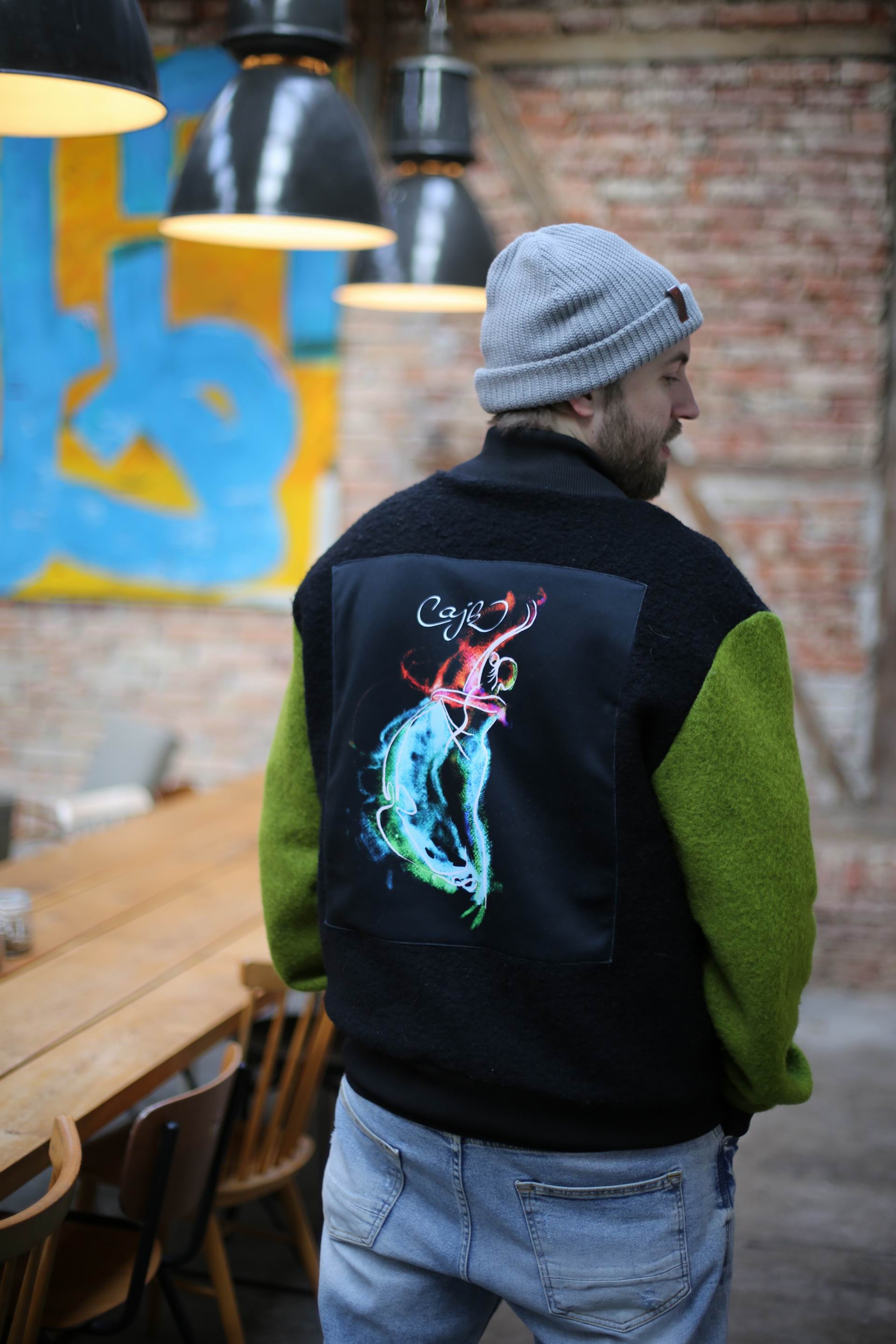 Jená se o vlněný barevně kombinovaný kousek klasické délky. Je opatřen zipem, podšívkou a vloženými kapsami. Na rukávu je malá kapsa na zip. Na zadní straně je na přání potisk tanečnice.