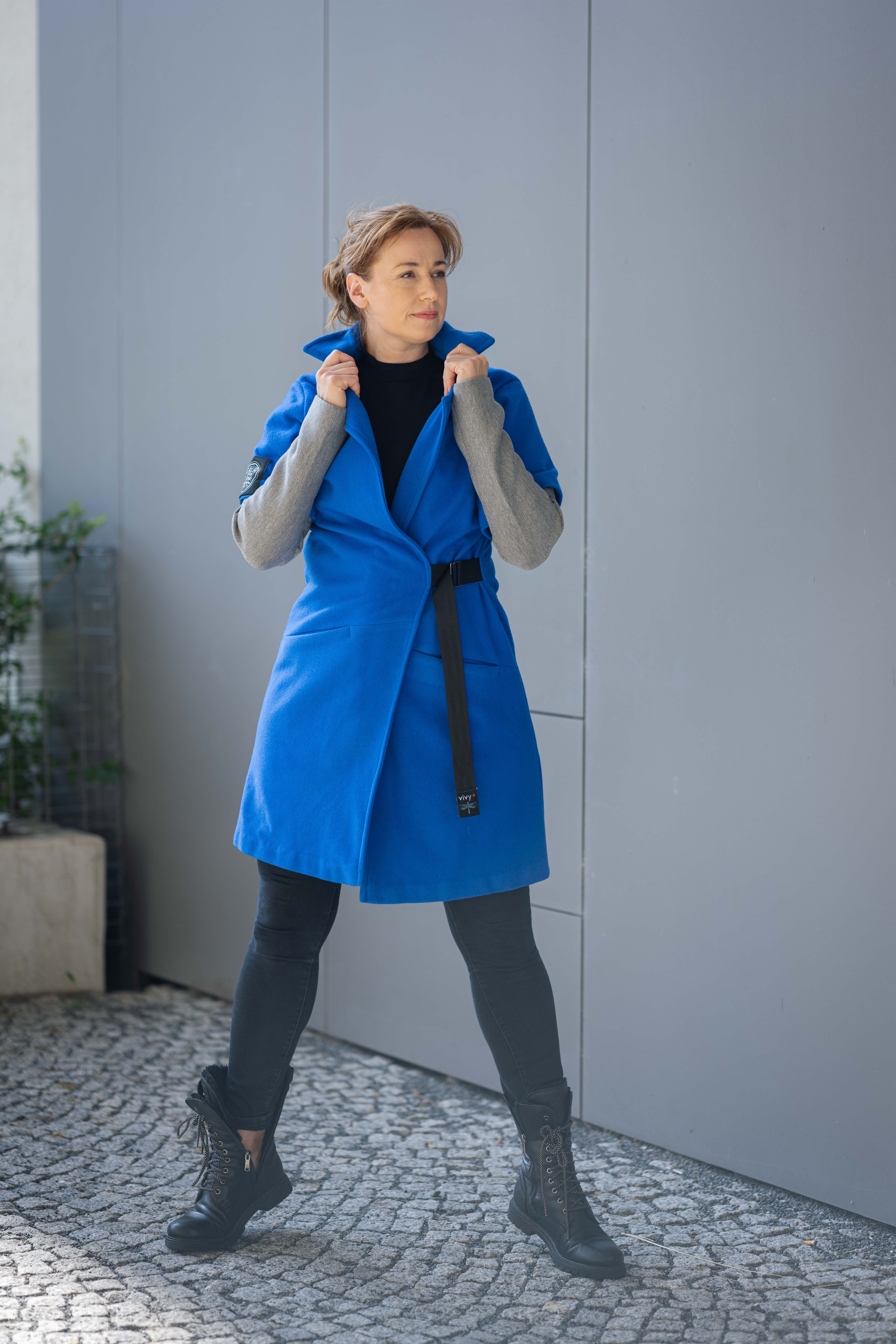 Jedná se o přechodový kabát z kombinace zimních látek. Kabát je zavinovací. Aktuálně v nabídce v galerie.