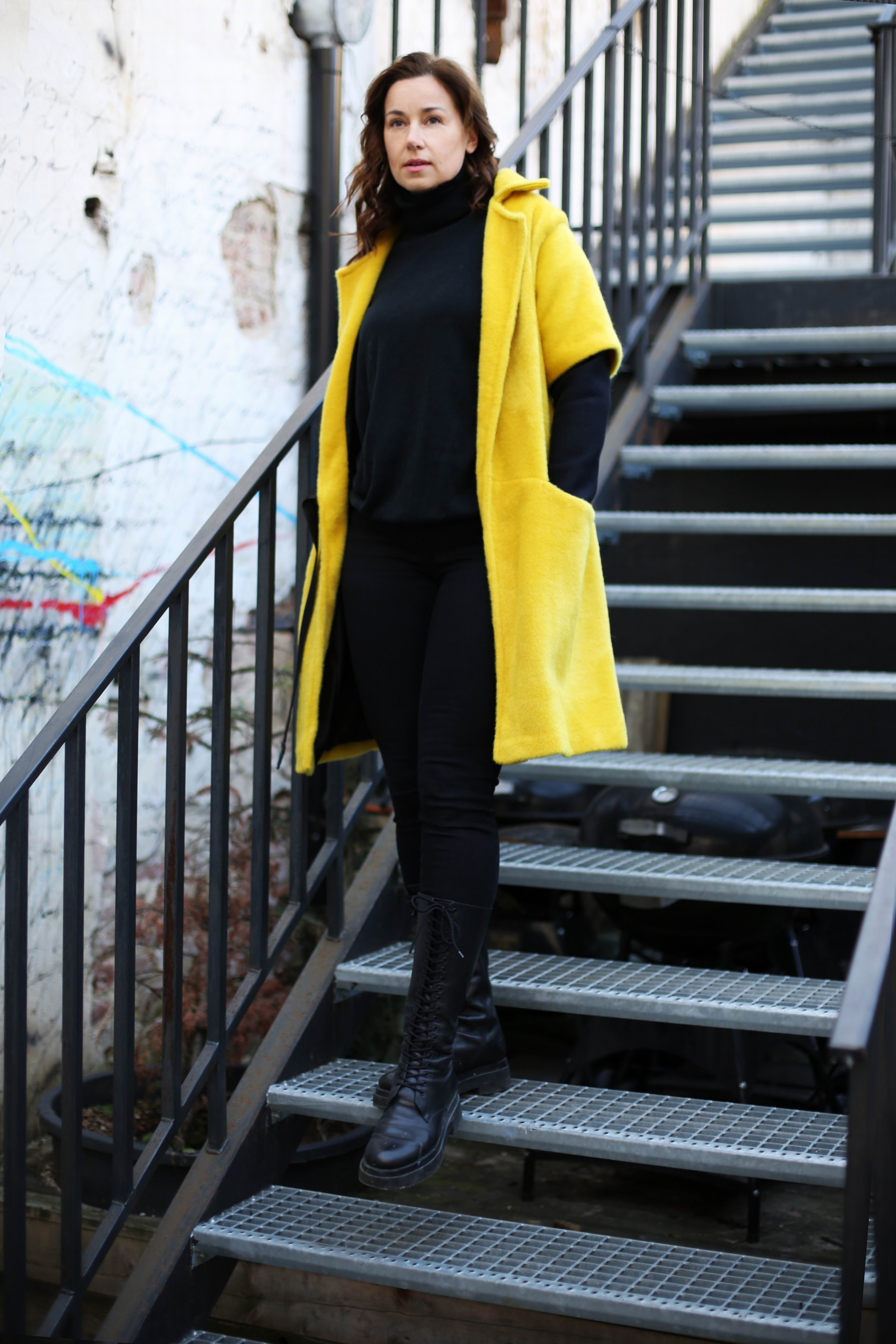 Jedná se o přechodový kabát z kombinace zimních látek. Kabát je zavinovací.
