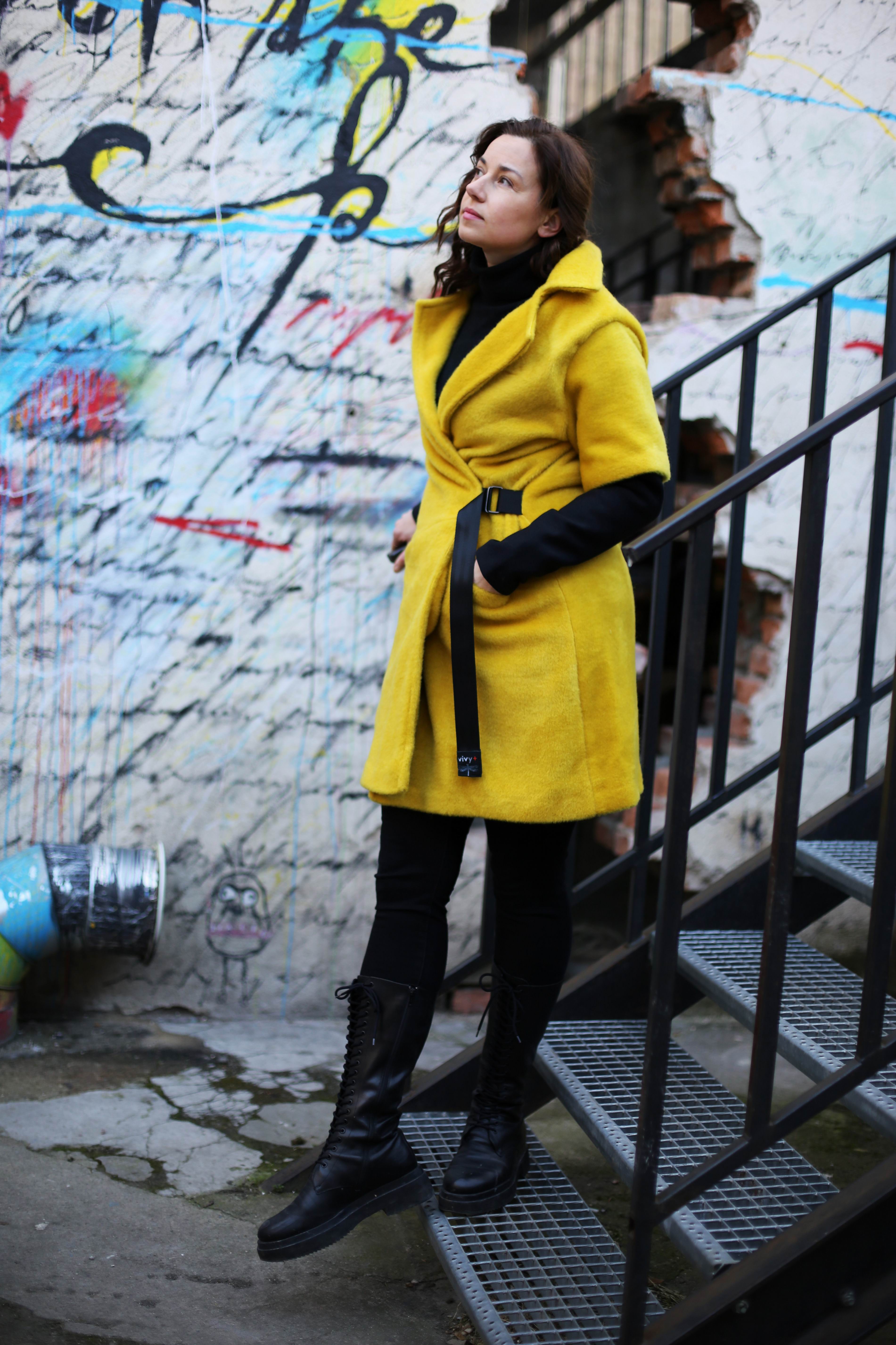 Jedná se o přechodový kabát z kombinace zimních látek. Kabát je zavinovací.