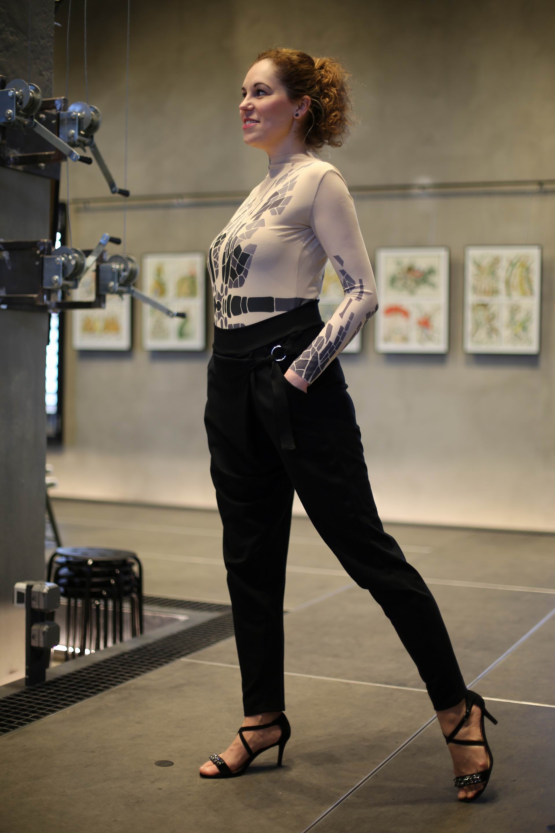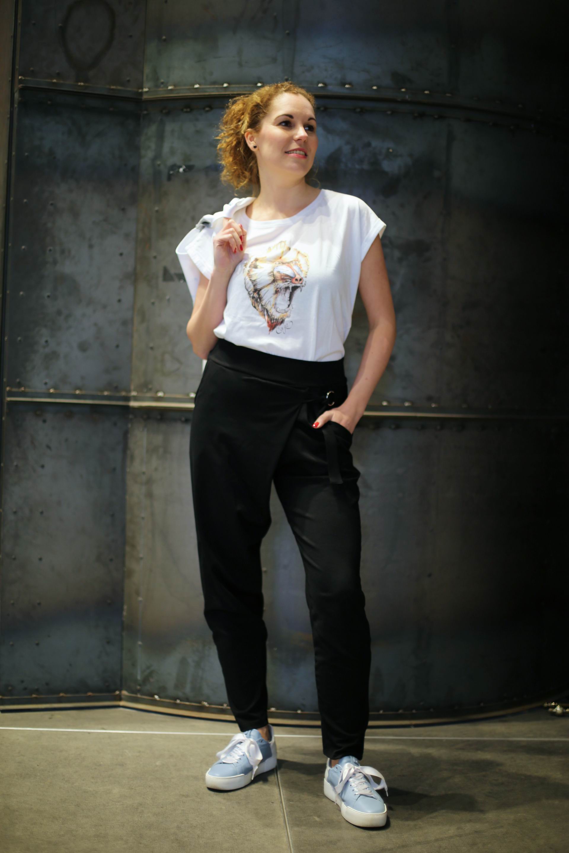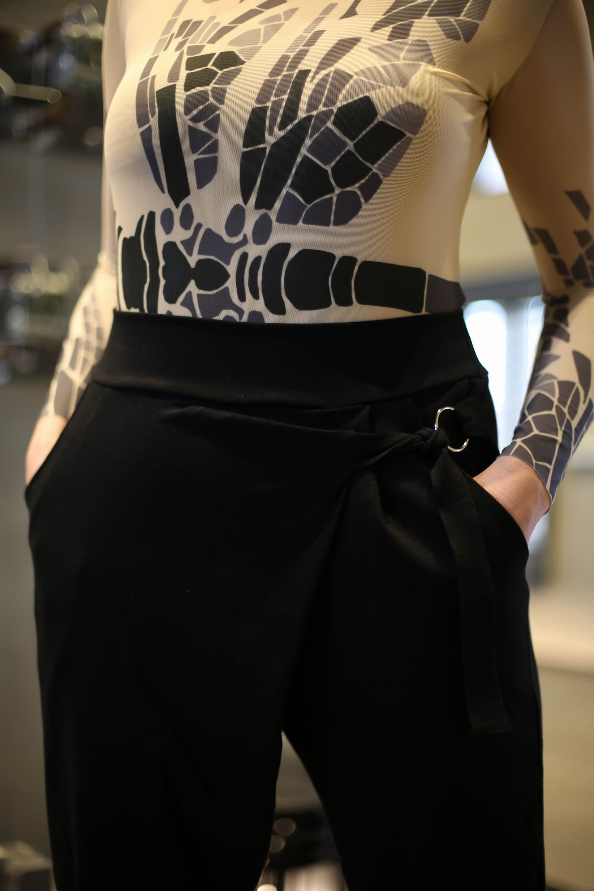 Velmi pohodlné kalhoty v asymetrickém designu se zavazováním na jedné straně, z pohodlné strečové pevnější úpletoviny. Kalhoty mají vpředu kapsy.